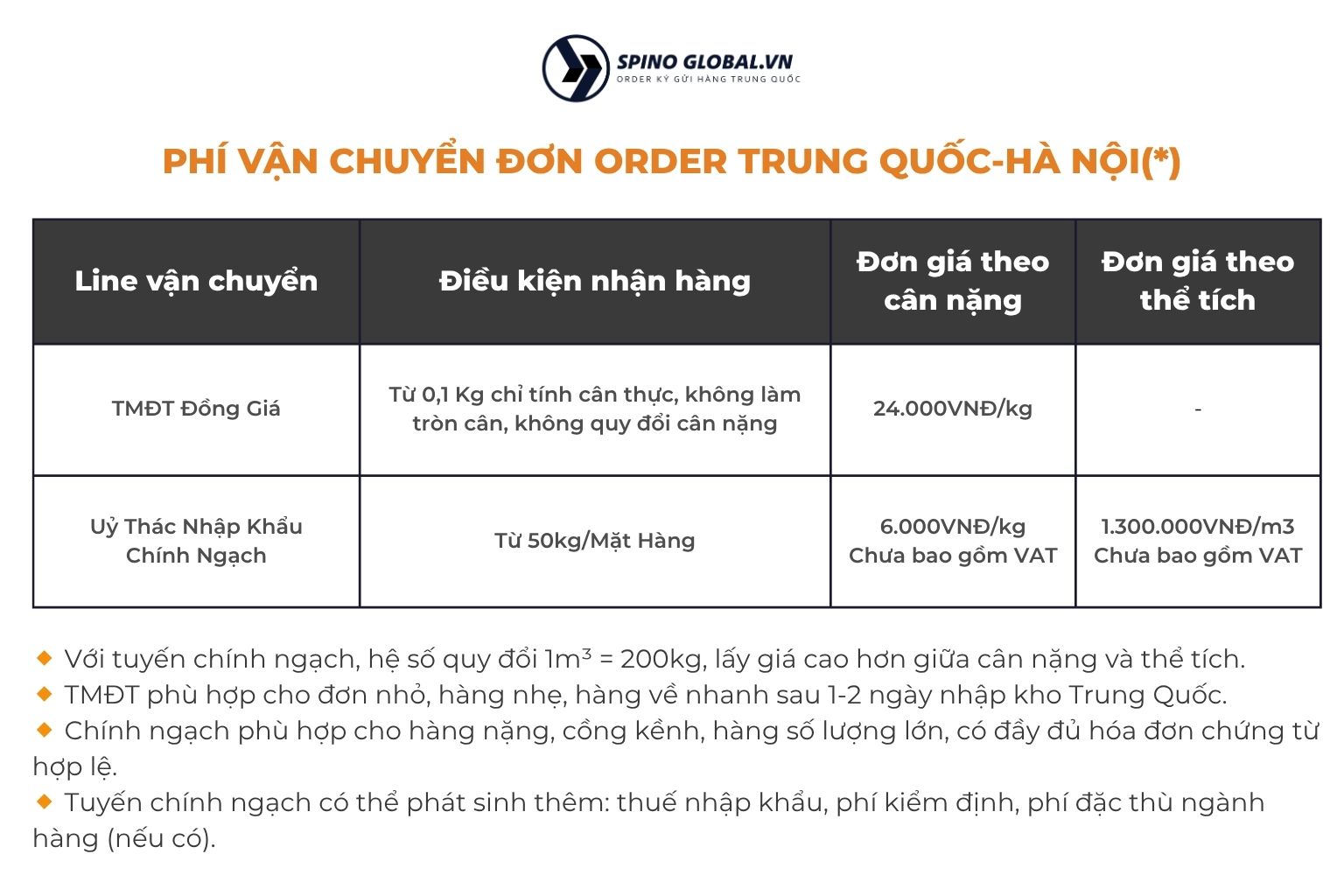 Nếu khách hàng không chọn đơn vị vận chuyển cụ thể hoặc muốn tối ưu chi phí, Spinoglobal sẽ chọn đơn vị phù hợp với bảng cước đồng giá như sau: