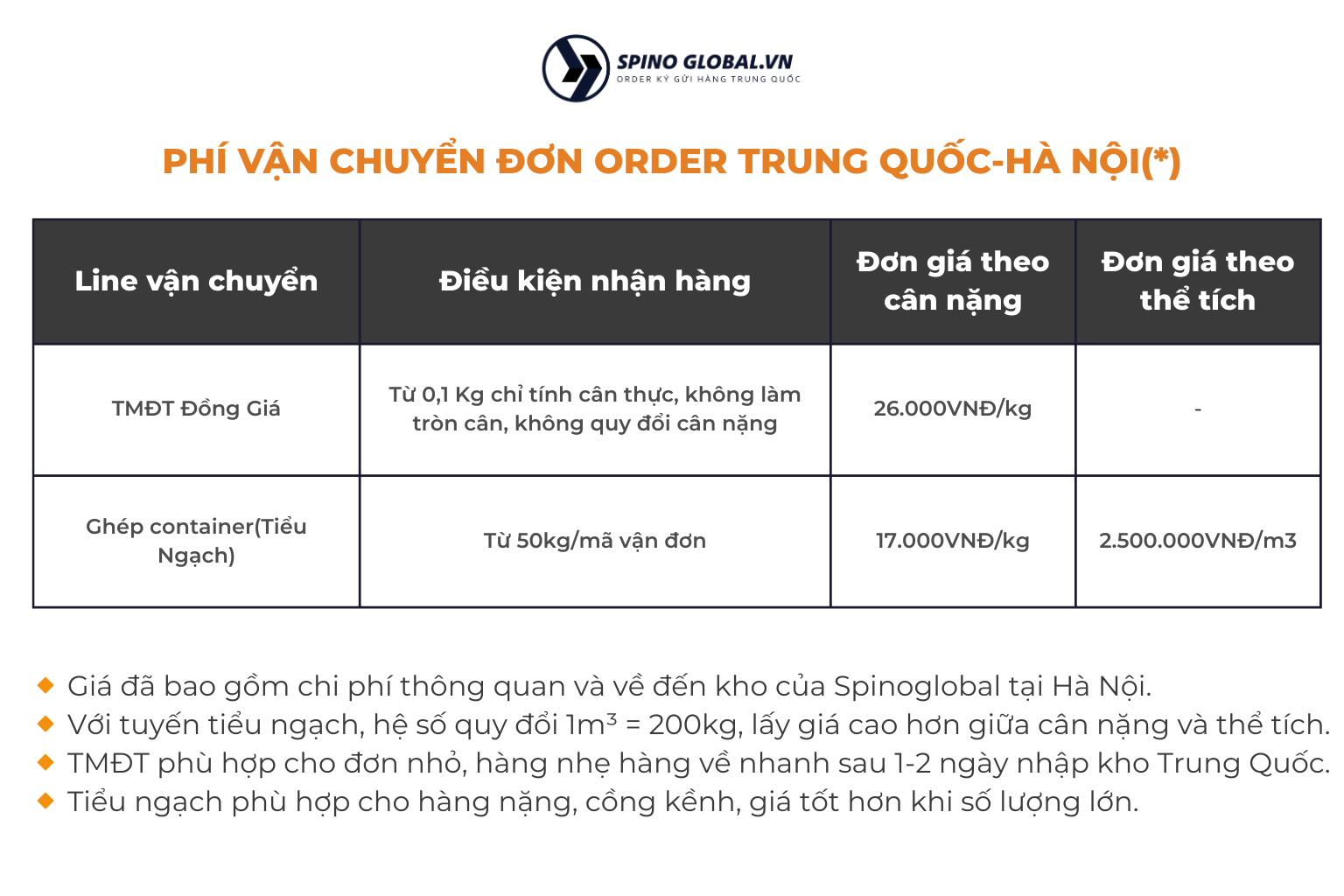 - Trong trường hợp quý khách hàng không lựa chọn hình thức nào hoặc muốn tối ưu chi phí vận chuyển. Spino global sẽ lựa chọn đơn vị vận chuyển Giao Hàng Nhanh hoặc Viettel Post với bảng cước vận chuyển đồng giá như sau:
