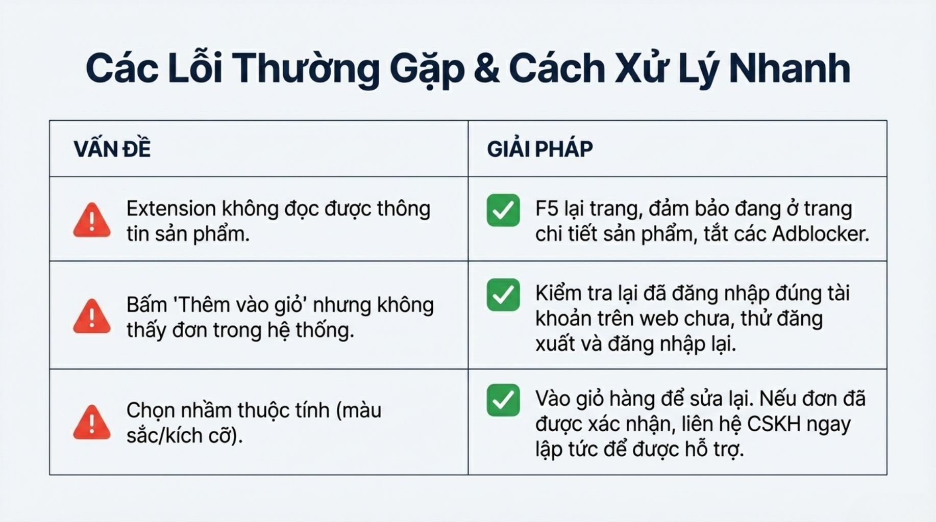 Nếu vẫn lỗi: gửi CSKH link sản phẩm + ảnh màn hình để kỹ thuật kiểm tra