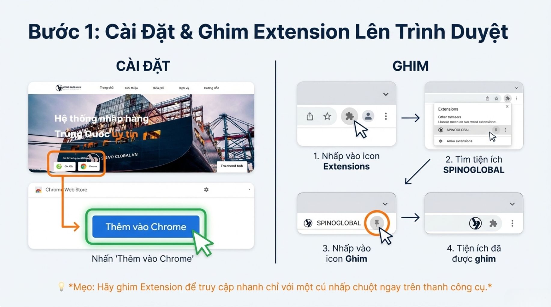 Vào biểu tượng mảnh ghép (Extensions) → Pin “SPINOGLOBAL”Link sản phẩm từ sàn Trung Quốc (1688/Taobao/PDD…).
