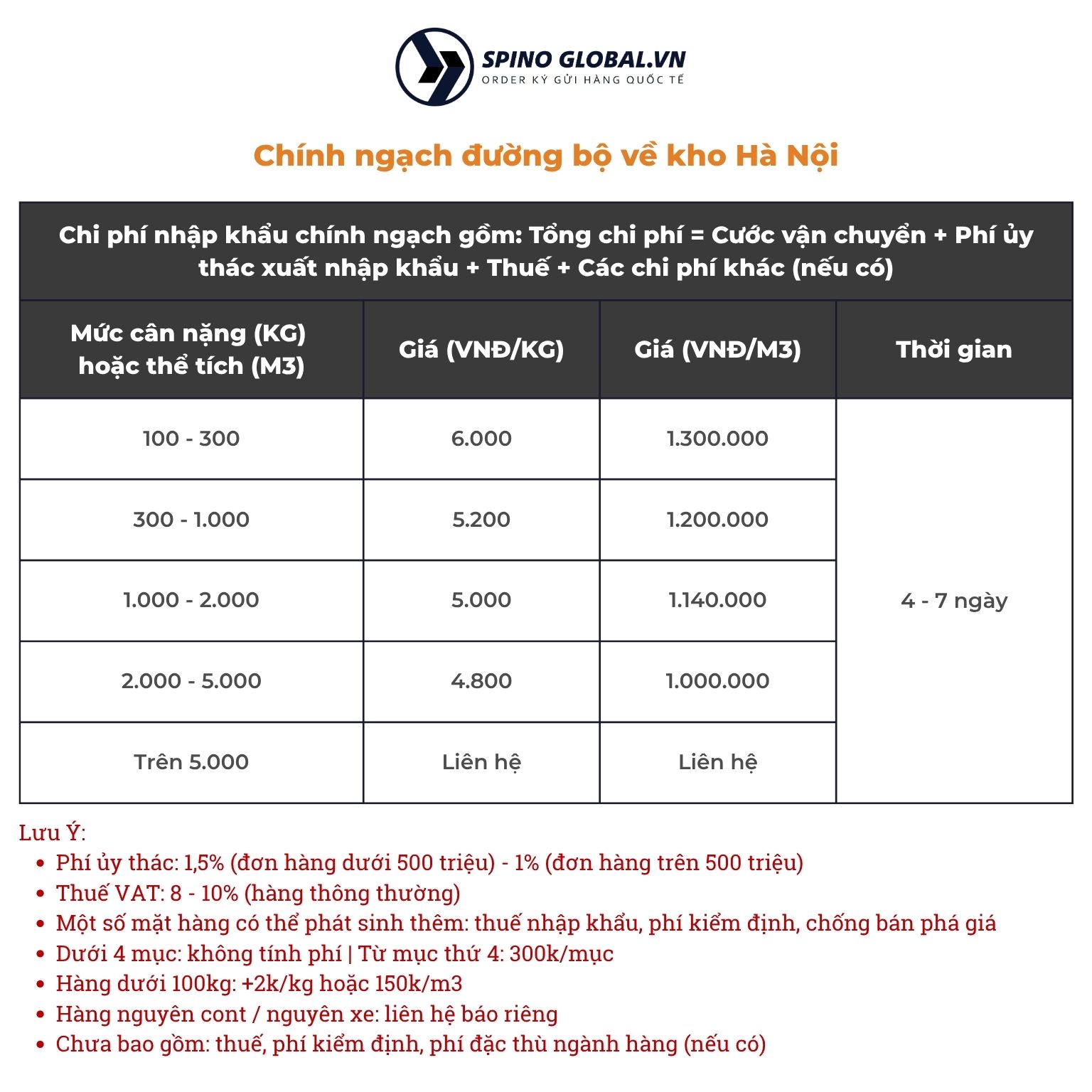2. Bảng giá vận chuyển ký gửi Line Chính ngạch đường bộ về kho Hà Nội
